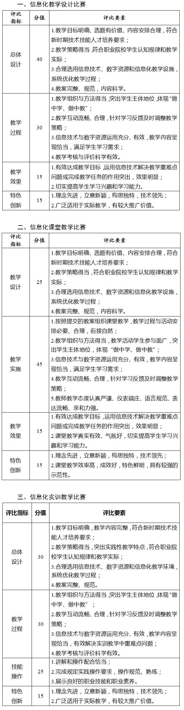 大赛分为中等职业教育组、高等职业教育组和军事职业组。每组均设立信息化教学设计赛项、信息化课堂教学赛项、信息化实训教学赛项。其中军事职业组比赛由中央军委训练管理部院校局具体组织实施。大赛赛项方案、参赛名额分配表、评分指标、参赛视频制作要求等有关材料在大赛官方网站(www.nvic.edu.cn)和我部政府网站职业教育与成人教育司页面公布。