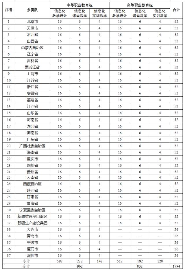 2017年全国职业院校信息化教学大赛参赛名额分配表